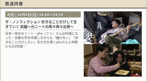 10月6日(日)と13日(日)に、フジテレビのザ・ノンフィクションに出ます。「好きなことだけして生きていく~元ニートの再々再々出発~」というタイトルです。残念ながら放送は関東ローカルだけなのですが。www.fujitv.co.jp ザ・ノンフィクション #60「お…